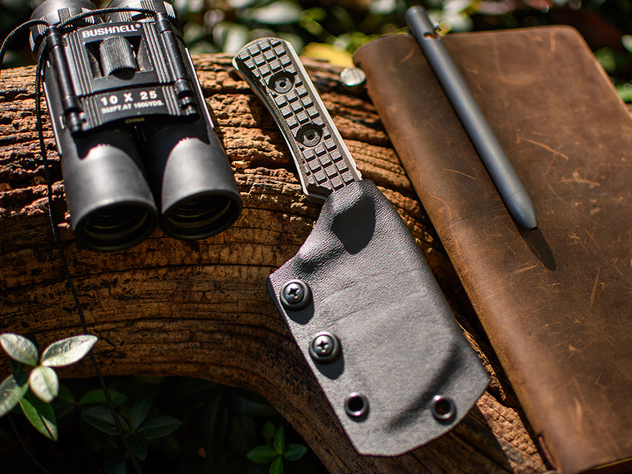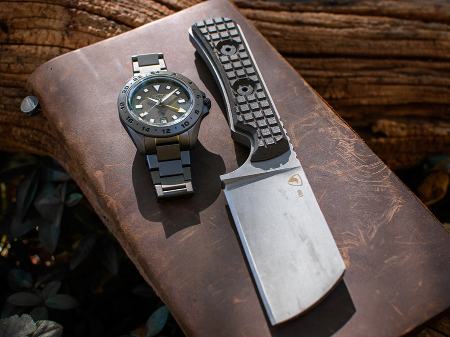 Built from D2 bar stock, the Trail Chopper is machined, heat treated, stone washed, and sharpened by hand. Its short, thick blade provides strength and control well beyond its size, while the dark olive green Cerakoted scales match the bezel color of the TrailTrekker—visually tying the knife and watch together as a matched set of tools.